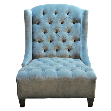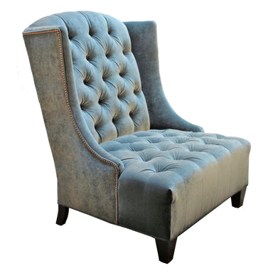 Oversized wing chair in luxuriously tufted velvet upholstery with gold nailhead trim accent. Available in light blue or green velvet. Made in the U...