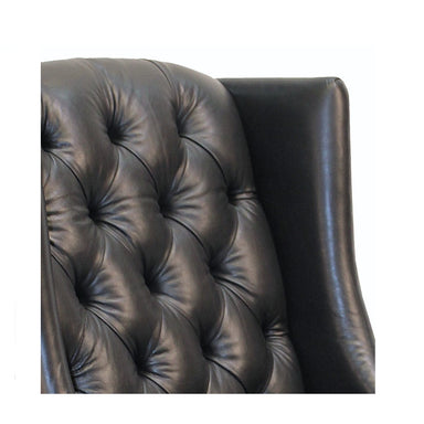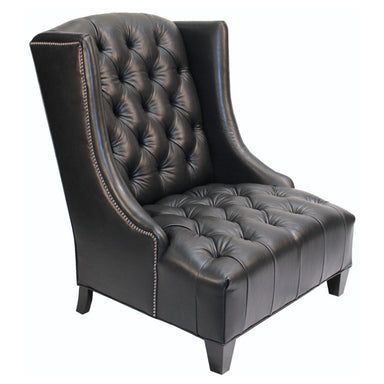 Oversized wing chair in luxuriously tufted genuine black leather upholstery with silver nickel nailhead trim accent. Made in the USA. Specification...