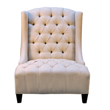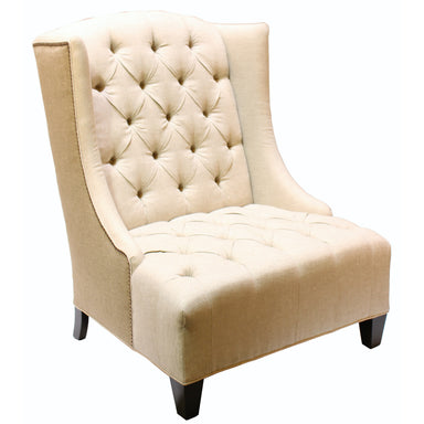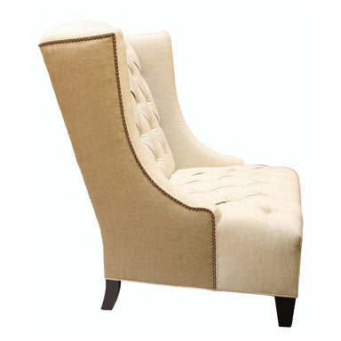 Oversized wing chair elegantly tufted in an oatmeal linen fabric. Burlap and nailhead trims accent the wings and add dimensional interest to this l...