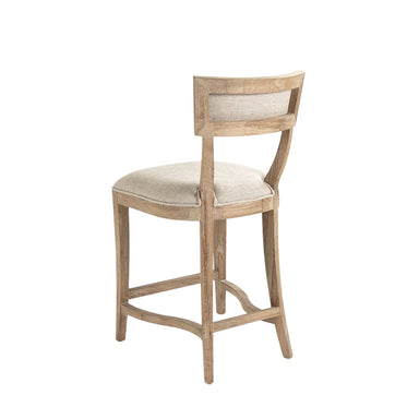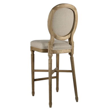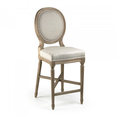 Round back counter stool with natural finish upholstered in natural linen. Dimensions (in)17.5W x 43H x 19.5DSeat Height (in)25 FinishNatural Oak...