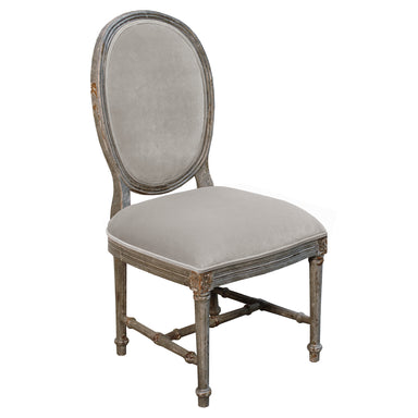 View full detailsThe comfort and elegance of French Country style shines through in this opulent oak chair finished in dove grey. Natural linen upholstery adds lu...
