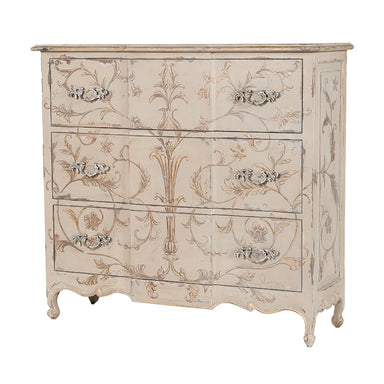 Vintage Bleu Gris with floral and vine artwork of grays and golds finished on tall three-drawer chest. Ornate finished drawer pulls. Dimensions (...