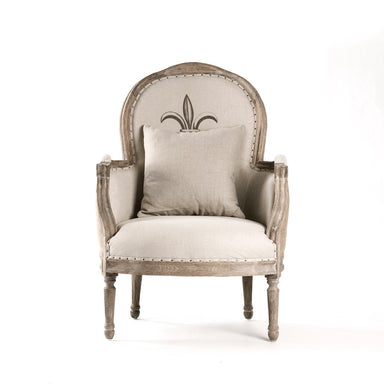 Oval back club chair upholstered in natural linen with fleur de lis print on limed grey oak frame with burlap back. Dimensions (in)27W x 38H x 30...
