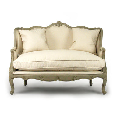 French country inspired settee with birch frame and linen upholstery. Dimensions (in)64.75W x 38.25H x 25D FinishGray Material(s)Birch, Linen Fea...