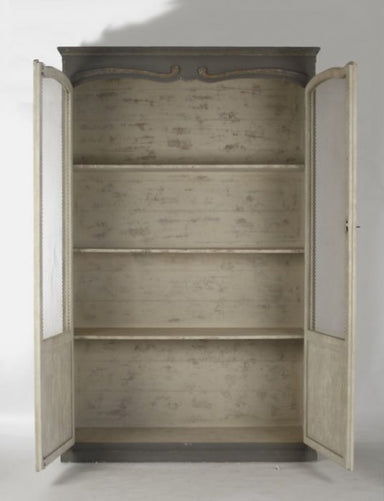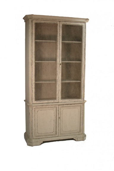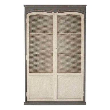 A beautiful farmhouse style display cabinet with distressed grey body and distressed off-white doors. Features rustic wired paneling on front doo...