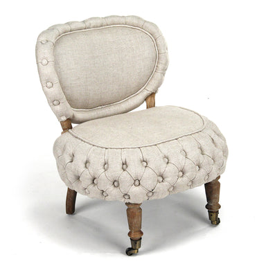 Slipper chair finished in limed grey oak with tufted edges and casters on front legs. Makes a lovely office chair! Dimensions (in)23W x 25H x 24D...