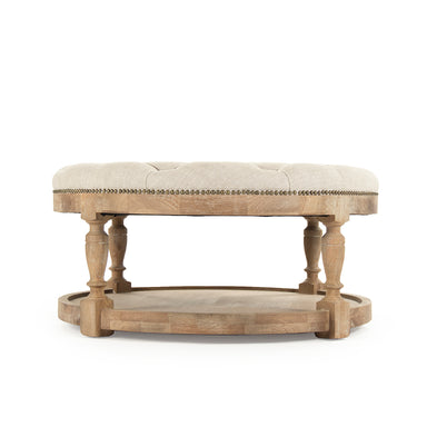 Round tufted ottoman upholstered in natural linen on limed grey oak frame with bottom storage space. Dimensions (in)35.5W x 17H x 35.5D FinishLim...