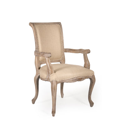 Straight scroll backed arm chair with cabriole legs. Upholstered in hemp linen with nail head trim on limed grey oak frame. Dimensions (in)24.5W ...