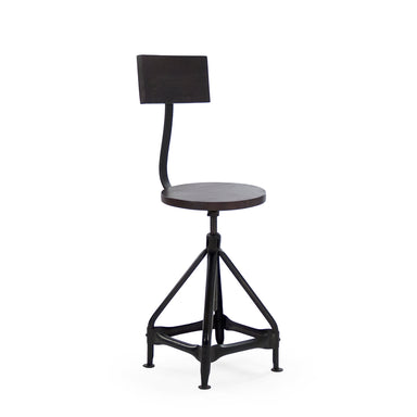 Black round seat bar stool with back rest, adjustable seat height, and made with a wooden seat and iron base. Also in this Collection:- Evoluti...