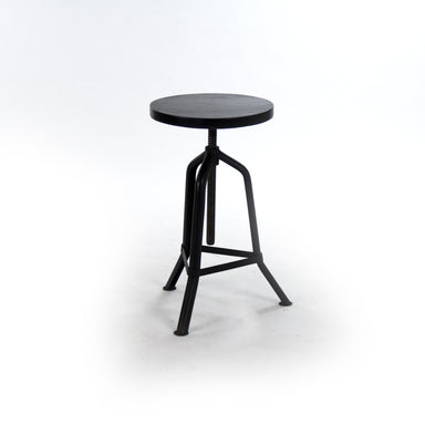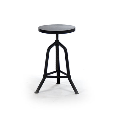 Black round top stool with three legs, adjustable seat height, and made with a wooden seat and iron base. Also in this Collection:- Evolution R...