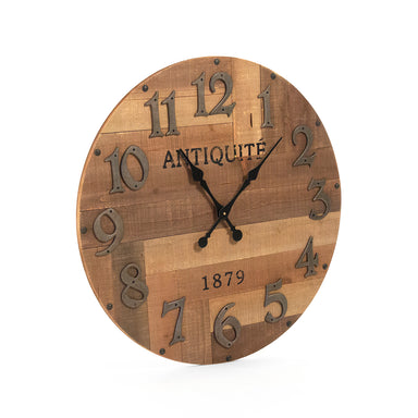 Clock with grey numbers on chevron patterned wooden panel background with nailhead trim accent. Dimensions (in)30W x 30H x 2D FinishNatural Backg...