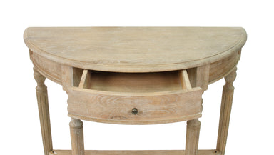Demilune shaped wall console with front drawer, four turned table legs and a bottom shelf for display. Dimensions (in)39W x 32H x 18D Available F...
