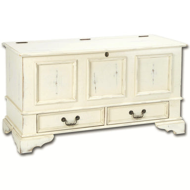 Finished in distressed white with bronze handles, the Newbury Blanket Chest has an elegant, antique look. Features 2 drawers for additional stora...