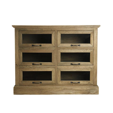 Made with durable weathered oak, the Battier Chest is the perfect addition to any room requiring extra space. Finely framed, glass drawers add di...