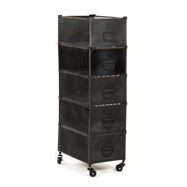 Stackable storage cabinet on wheels in antique black finish. Dimensions (in)18.5W x 44H x 12D FinishAntique Black Material(s)Iron Features- Stora...
